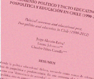 Alarcón, J., Johnston, E., & Frites, C. (2014). Consenso político y pacto educativo: pospolítica y educación en Chile (1990-2012). UNIVERSUM, 29(2), 37–48.