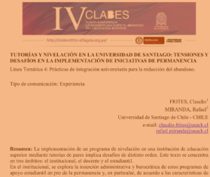 Frites, C., & Miranda, R. (2014). Tutorías y nivelación en la Universidad de Santiago: tensiones y desafíos en la implementación de iniciativas de permanencia.